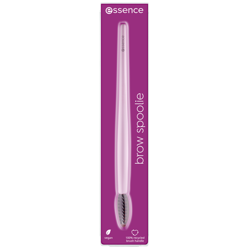 essence Brow spoolie Brush, with a unique shape and color, features soft bristles for comfortable brow shaping. The soft-touch handle, made from 100% recycled material, aids in creating a natural look. Ideal for combing and smoothing brows.