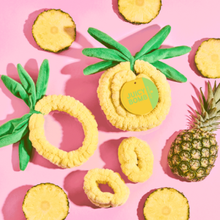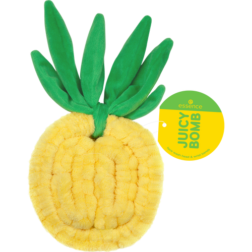 essence JUICY BOMB PARTY Face Wash Head & Wrist Bands include a soft, stretchy pineapple headband and wristbands to keep hair dry and water off your arms. Whether you're cleansing, masking, or doing makeup, this set keeps your routine mess-free.